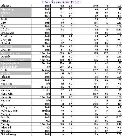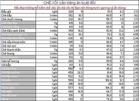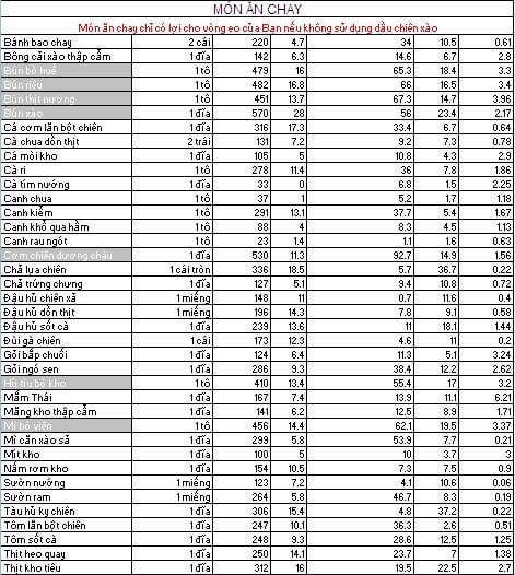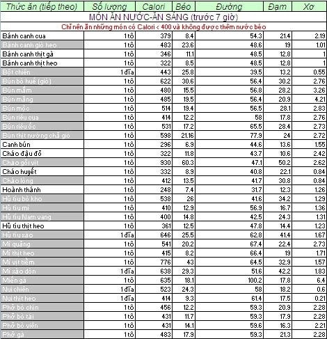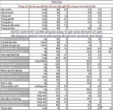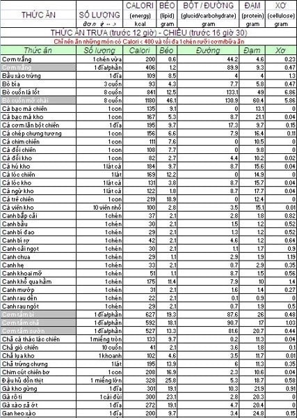 BẢNG TÍNH CALORIES TRONG THỰC PHẨM DÀNH CHO NGƯỜI GIẢM CÂN VÀ TĂNG CÂN